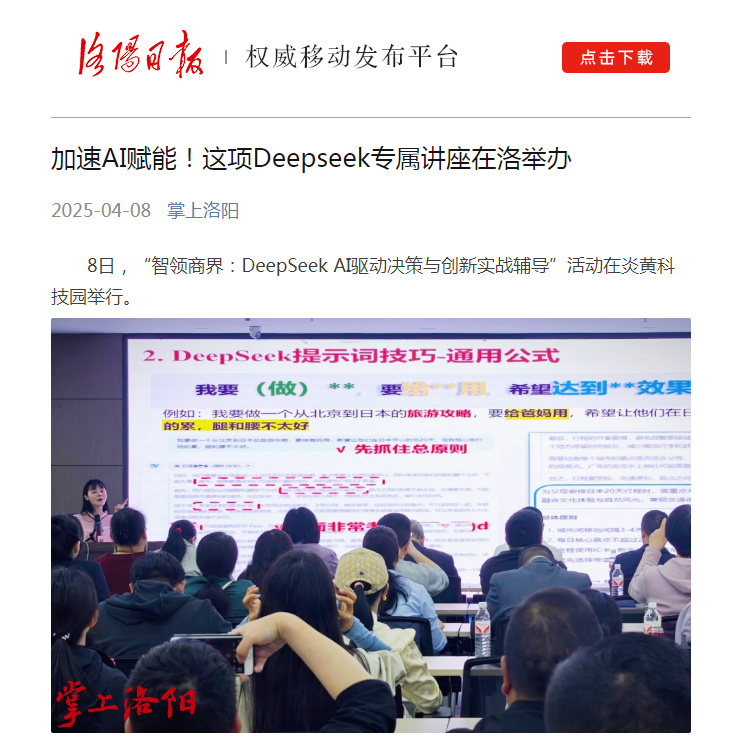 4月8日,“智領(lǐng)商界:DeepSeek AI驅(qū)動(dòng)決策與創(chuàng)新實(shí)戰(zhàn)輔導(dǎo)”培訓(xùn)活動(dòng)在炎黃科技園舉行,轉(zhuǎn)發(fā)洛陽日報(bào)、中華網(wǎng)的相關(guān)報(bào)道——