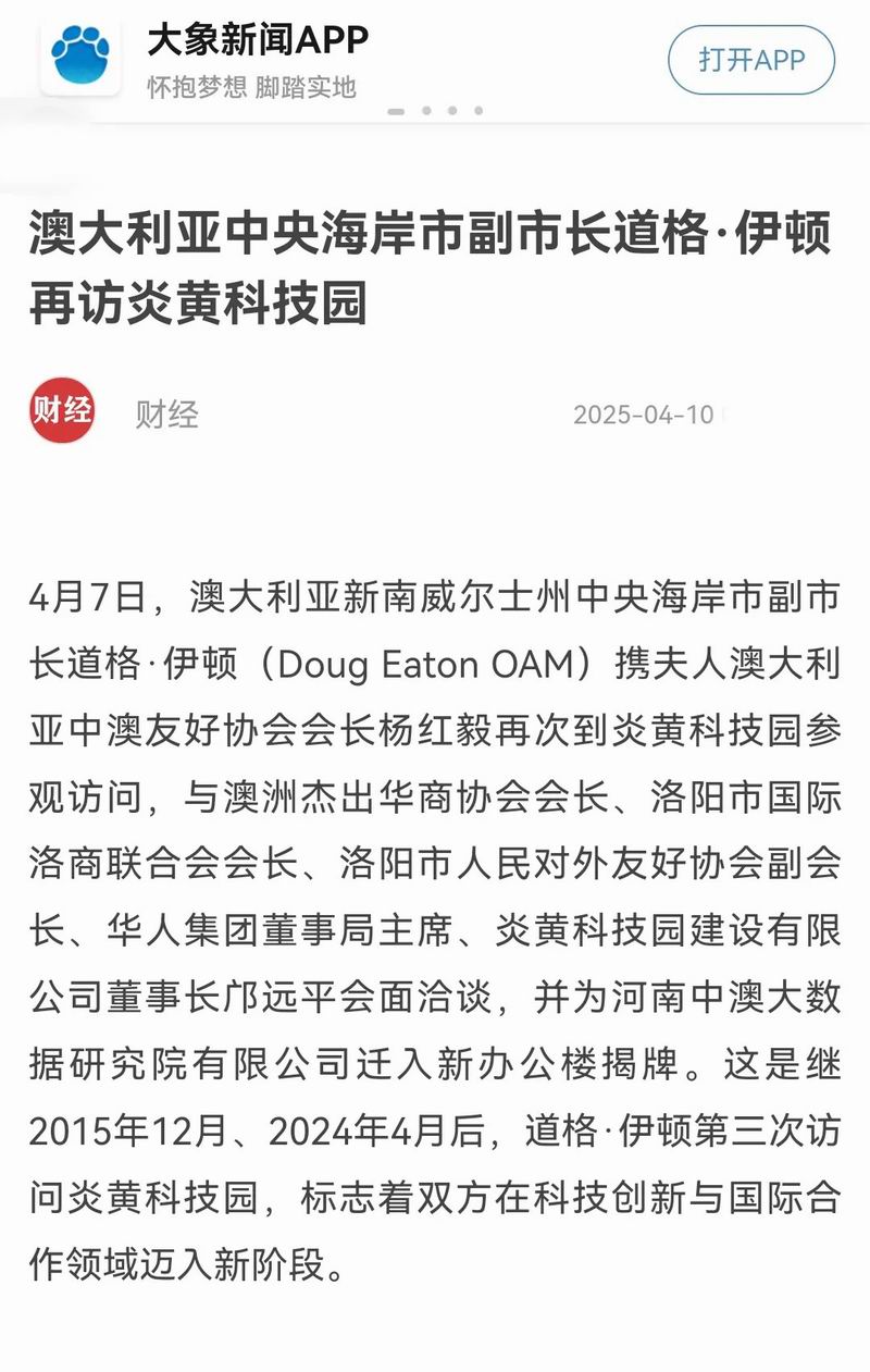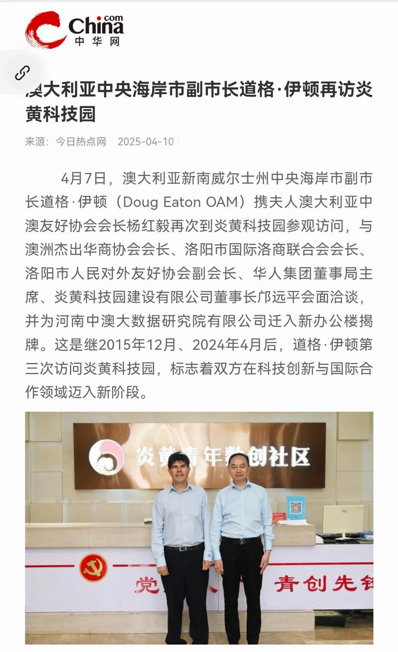 4月7日,澳大利亞新南威爾士州中央海岸市副市長道格·伊頓(Doug Eaton OAM)攜夫人澳大利亞中澳友好協(xié)會會長楊紅毅再次到炎黃科技園參觀訪問,與澳洲杰出華商協(xié)會會長、洛陽市國際洛商聯(lián)合會會長、洛陽市人民對外友好協(xié)會副會長、華人集團董事局主席、炎黃科技園建設有限公司董事長鄺遠平會面洽談,并為河南中澳大數(shù)據(jù)研究院有限公司遷入新辦公樓揭牌。這是繼2015年12月、2024年4月后,道格·伊頓第三次訪問炎黃科技園,標志著雙方在科技創(chuàng)新與國際合作領域邁入新階段。